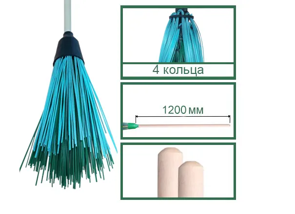 Что позволяет инвентарю захватить больше мусора? Его объемность. Метла пушистая, потому что состоит из четырех колец, которые плотно держат полипропиленовые прутья. Сам пластик легкий, что позволяет тратить меньше сил на подметание.
