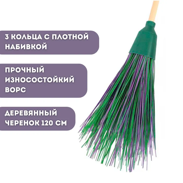 Удобная и прочная уличная метла для эффективной уборки территории. Оснащена тремя кольцами с плотной набивкой, что обеспечивает высокую износостойкость и долговечность. Жёсткий пластиковый ворс отлично справляется с листвой, мусором и пылью даже на неровных поверхностях. Метла укомплектована деревянным черенком длиной 120 см — оптимальной для комфортной работы без лишней нагрузки на спину.